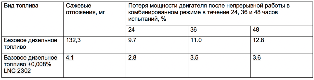 - Снижение образования отложений на распылителях форсунок, лопатках турбонагнетателя не менее 90%;